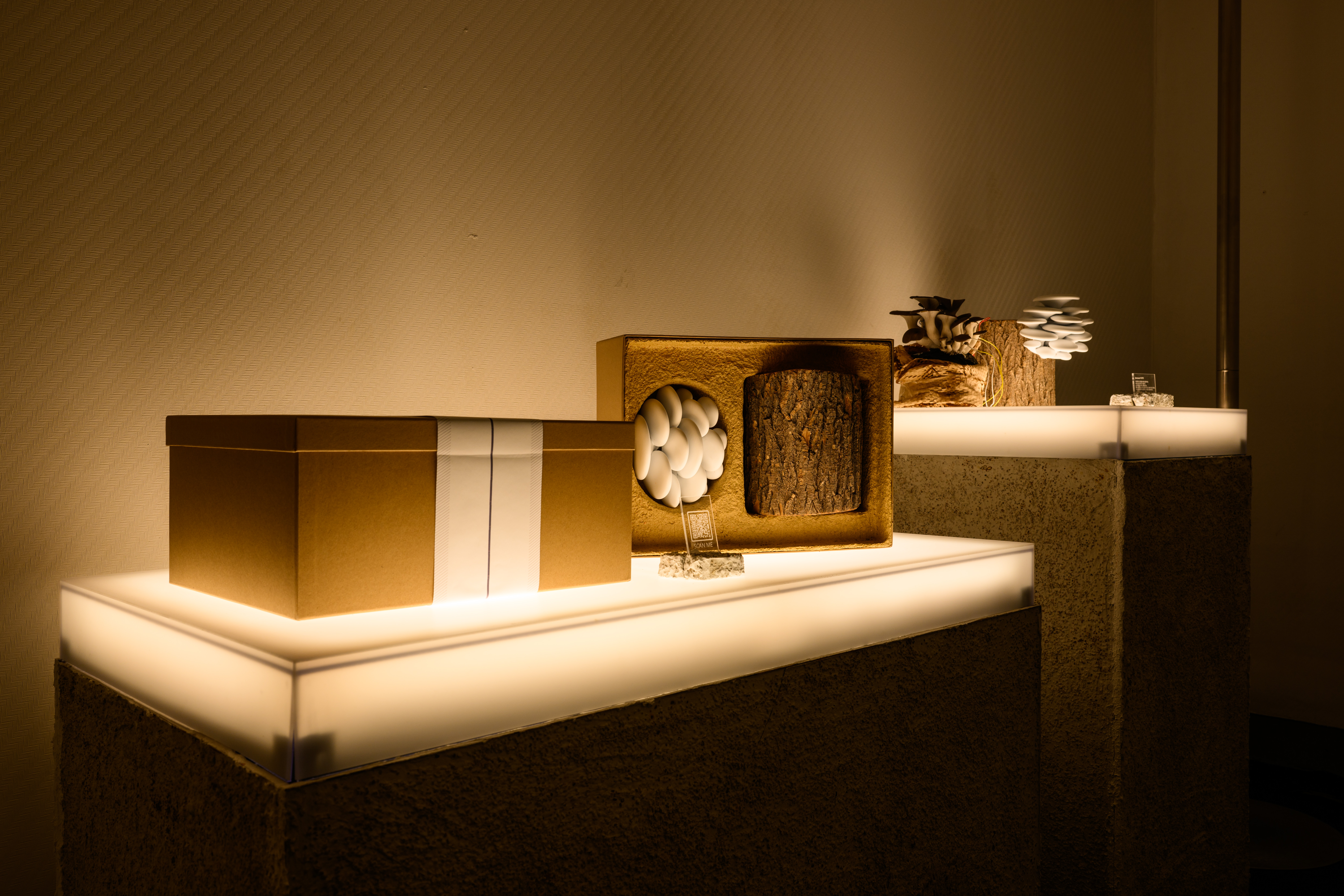 Oyster mushroom, biofeedback sensor, sound modules, super directional speaker, dimensions variable