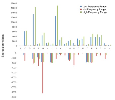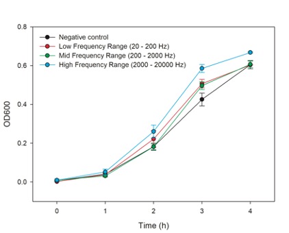 디지털로 합성된 white noise를 저음, 중음, 고음의 세 음역대로 filtration하여 Low Frequency Range (LFR: 20 ~ 200 Hz), Mid Frequency Range (MFR: 200 ~ 2000 Hz), High Frequency Range (HFR: 2000 ~ 20000 Hz)로 만들고, 이에 노출 되었을 때, up/down regulation되는 E.coli K-12의 유전자를 확인 하였다. 또한, 소리에 노출되었을 때, 생장곡선이 달라짐도 확인하였다.